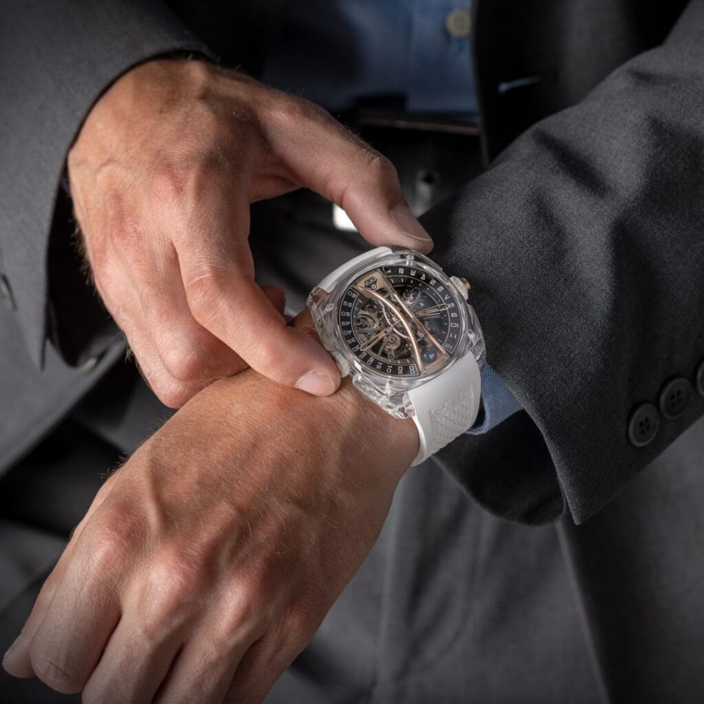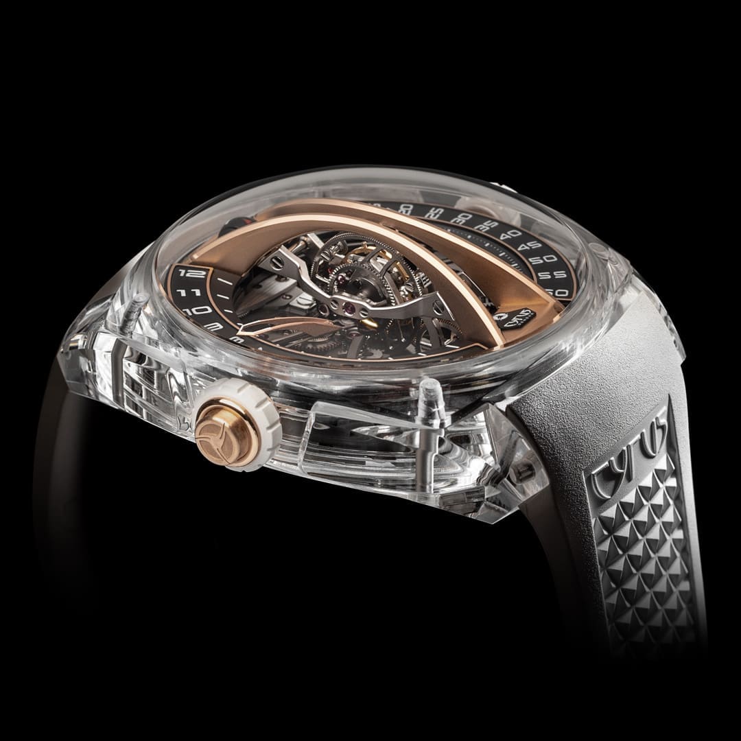 Jubileumsklockan är minst sagt speciell. Urtavlan är tredimensionell och har en transparent safirglasboett (44 mm) som gör verket synligt från alla vinklar. Boetten i safirglas ska ha varit en utmaning i tillverkningen. De komplexa formerna krävde att man använde små verktyg vilket gör att det blir tidskrävande. Även poleringen krävde många timmars arbete. Ett arbete som krävde försiktighet eftersom safirens hårda karaktär kan göra att kanterna smulas sönder under tryck. Om det händer är det bara att börja om från början igen.