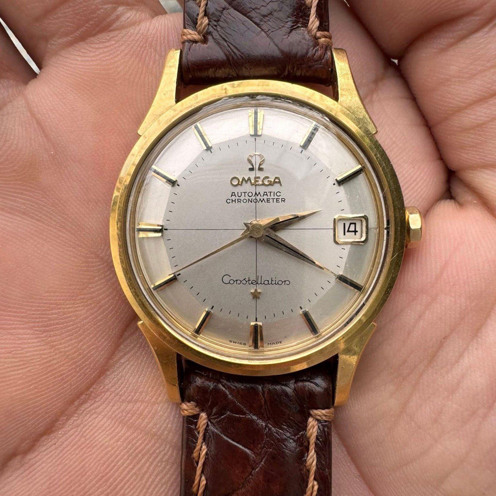 Det finns något väldigt tilltalande med äldre Constellation. Inte bara för att de är snygga,  utan för att de representerar en tid när Omega verkligen positionerade sig i toppen av industrin. Under 60-talet var Constellation deras flaggskepp i det mer dressade segmentet, ofta utrustad med kronometercertifierade urverk. Och det märks. Finishen i boett och tavla är på en nivå som är svår att hitta i moderna klockor i samma prisklass. Pie-pan-tavlorna är kanske det mest ikoniska inslaget. Den subtila lutningen mot indexen skapar ett djup som ger liv åt hela klockan. Lägg till applicerade index, ofta med en lätt patina, och du får något som känns betydligt mer levande än en modern, perfekt tavla. Storleken på runt 34–35 mm kan kännas liten på pappret, men på handleden fungerar det förvånansvärt bra – särskilt om man är ute efter något mer dressat. Det här är inte en klocka man köper för att den är “praktisk”. Det är en klocka man köper för att den har själ.