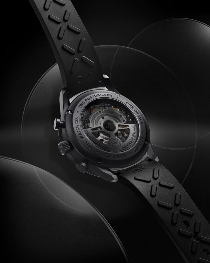 Tavlan är djupt svart med de klassiska Portugieser-elementen: arabiska siffror, slanka feuille-visare och de symmetriskt placerade subdialerna för små sekunder och 30-minutersräknare. Under ytan arbetar kaliber 69355, IWCs in-house-kronograf med kolumnhjul och cirka 46 timmars gångreserv. Det är en välbeprövad konstruktion som ger modellen substans bortom den estetiska uppdateringen. Det är intressant hur IWC lyckas omtolka en så historiskt förankrad modell utan att förlora dess identitet. Portugieser har sina rötter i 1930-talets marina kronometrar, men i Ceratanium-utförande förflyttas den in i en modern, nästan futuristisk kontext. En klassiker i svart kostym, men med stridskängor under bordet.
