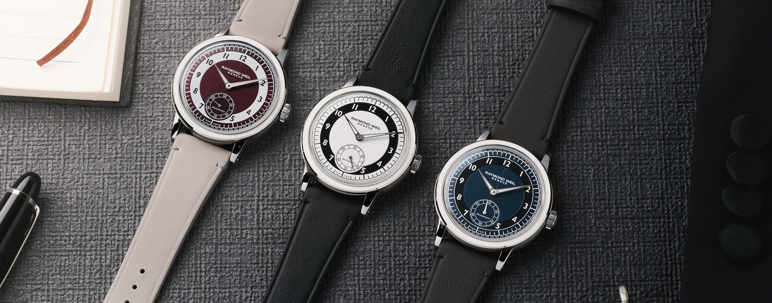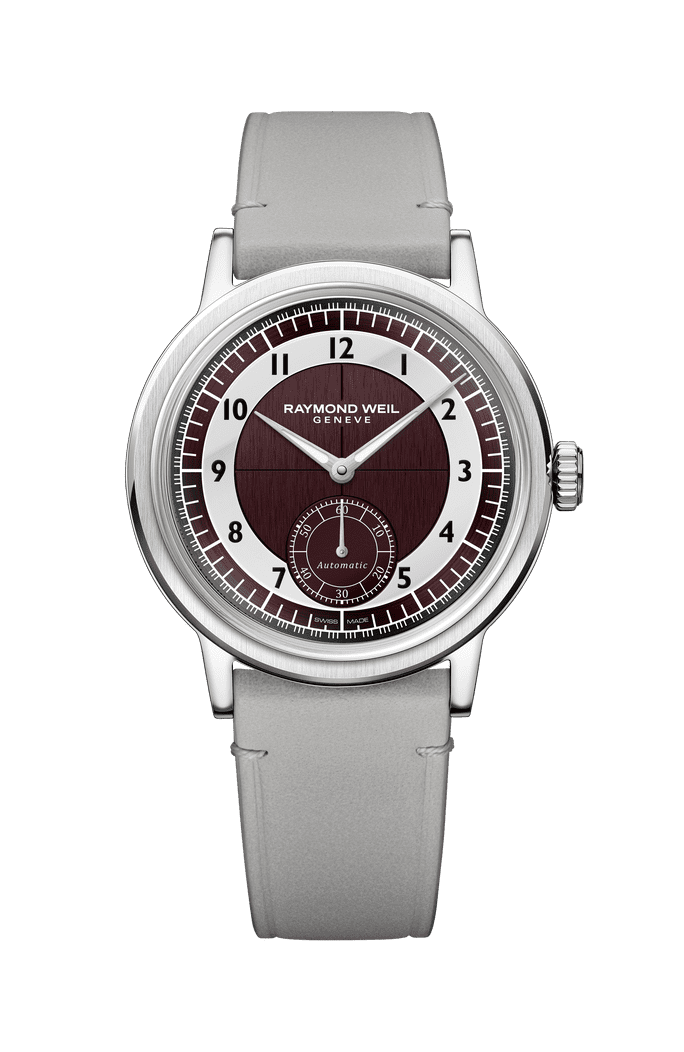 Raymond Weil bygger vidare på succén med Millesime-kollektionen och presenterar nu nya versioner med så kallad tuxedo-tavla och små sekunder i 39 millimeters boett. Det är en modell som tydligt flirtar med 1930- och 40-talens sektorindelade tavlor, men i en proportion som känns helt rätt i samtiden. Tuxedo-designen kännetecknas av kontrasterande ringar i svart och silver, där minutspåret ramas in grafiskt och ger tavlan djup. Kombinationen av borstade och polerade ytor skapar ett spel mellan ljus och mörker, medan den nedsänkta subdialen för små sekunder vid klockan sex ger balans. Det är en dressad estetik, men utan att bli ömtålig eller överarbetad.