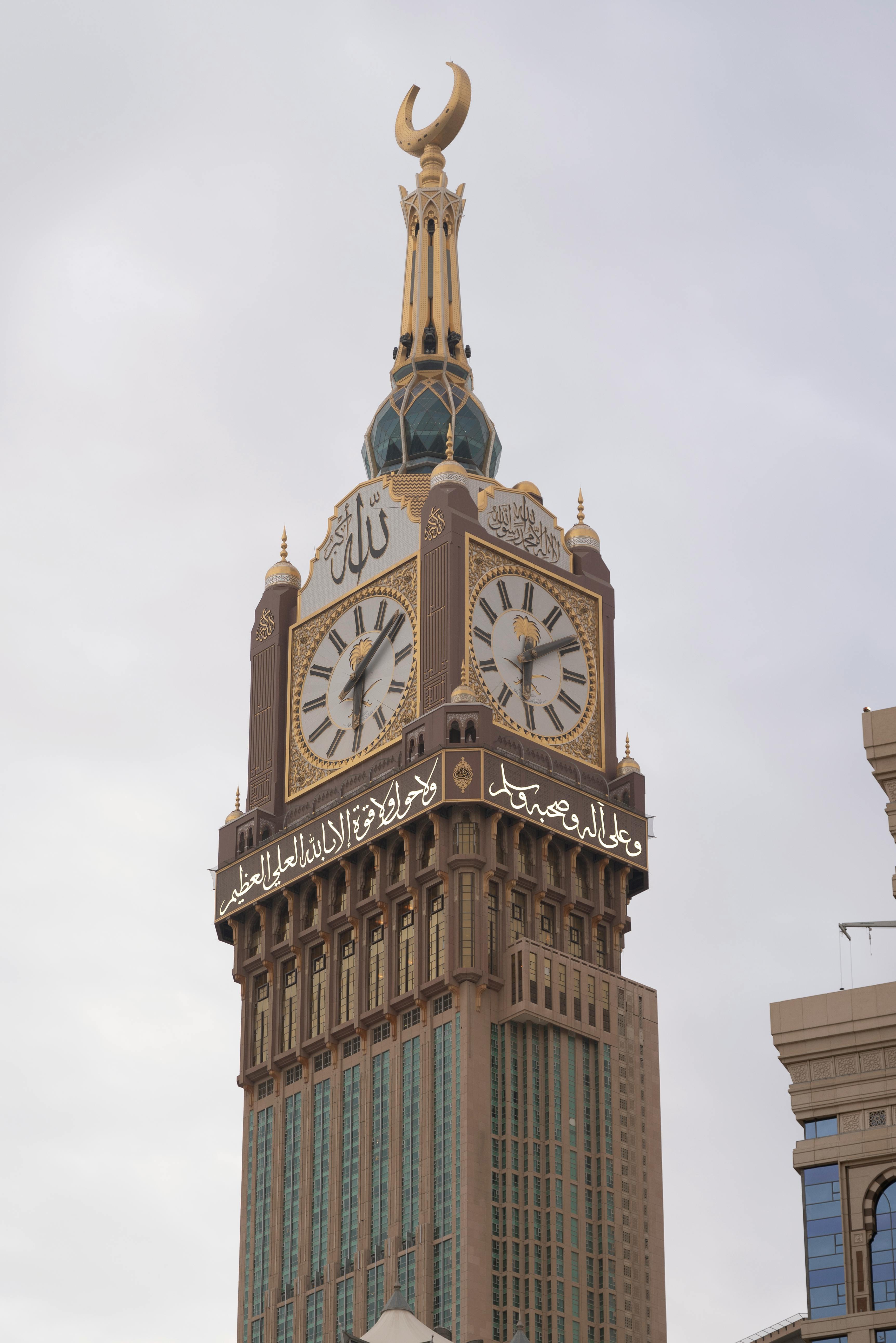 Mitt i Mecka, islams heliga stad, direkt intill den Stora moskén och Kaba, står Makkah Royal Clock Tower. Tornet reser sig drygt 600 meter över stadens täta bebyggelse och dominerar fullständigt horisonten. I vilken stad som helst skulle det dominera stadsbilden. I Mecka blir det istället en arkitektonisk förlängning av den heliga geografin. Här, där miljontals människor varje år samlas för pilgrimsresan hajj, där kroppen rör sig i cirklar runt Kaba och där blicken orienteras mot qibla, har tiden en särskild betydelse. Den är inte bara kronologisk utan rituell. Den styr böner, fastor, högtider och pilgrimernas rörelser. Det är denna tid som klocktornet synliggör.