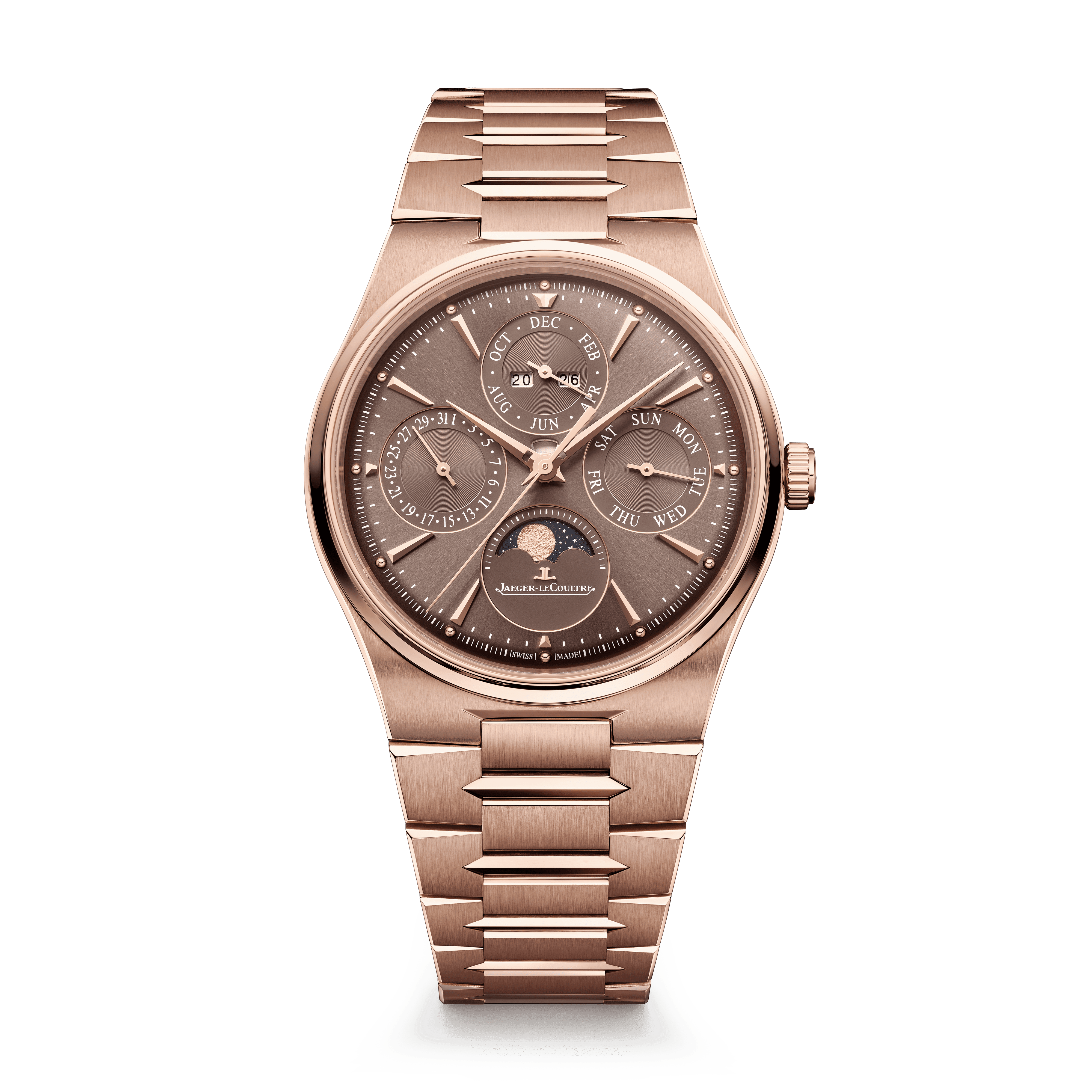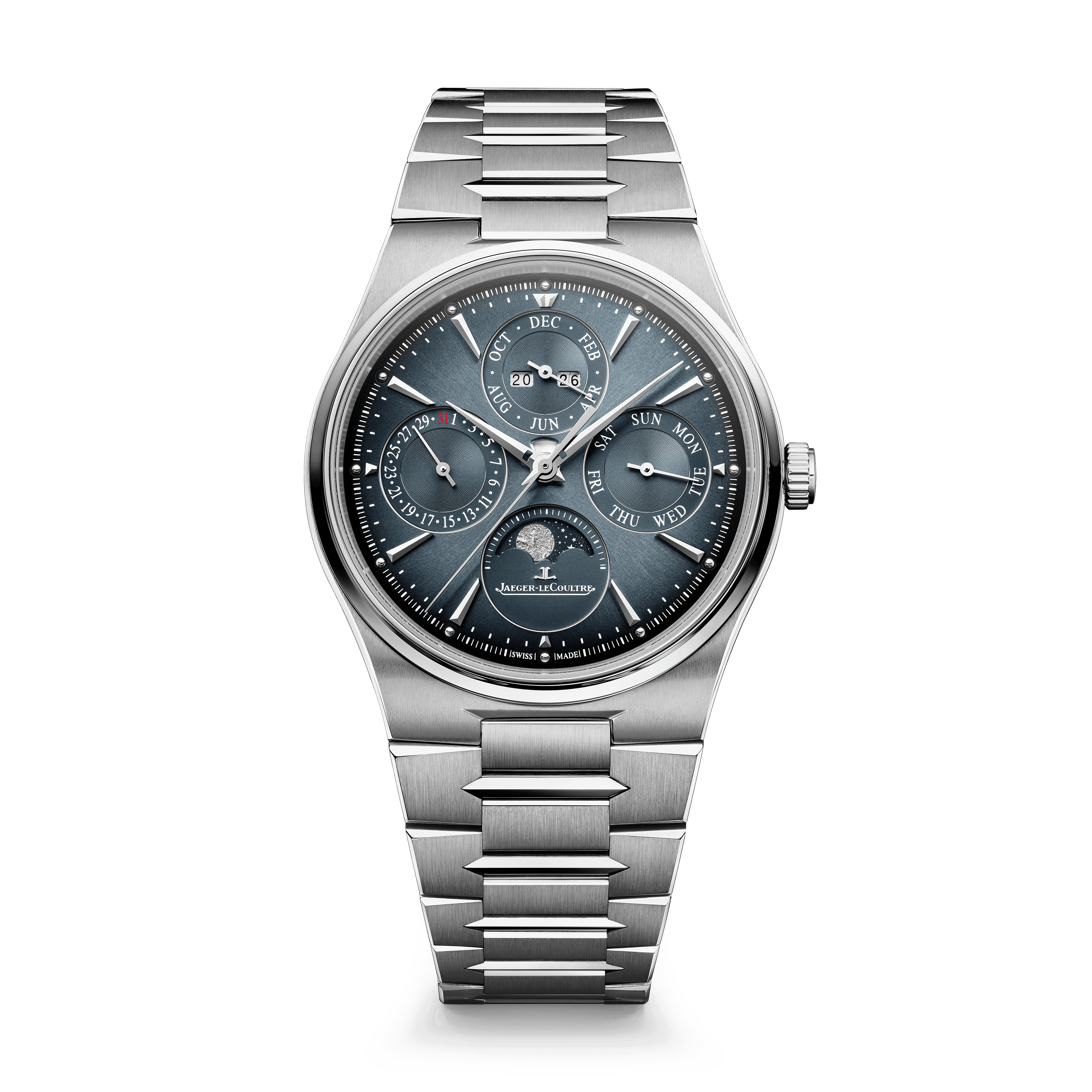 Jaeger-LeCoultre fortsätter att utveckla Master Control-serien med en evighetskalender som kombinerar teknisk tyngd med en modern estetik. De fyra subdialsen visar månad, datum, dag och månfas i en balanserad layout som känns både klassisk och samtida.